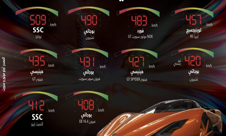 يتناول الأنفو جراف أسرع 10 سيارت في العالم وتتراوح سرعتهم من 408 إلى 509 كيلو متر في الساعة الواحدة.