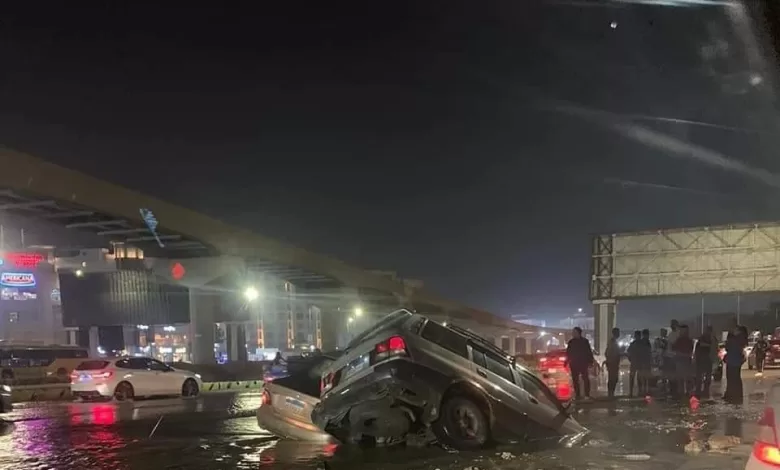بسبب هبوط أرضي وتراكم مياه الأمطار تصدر شارع التسعين الجنوبي الزحام على مدار اليوم، وتداول رواد السوشيال ميديا والمواقع سقوط بعض السيارات، وذكر شهود عيان أن قوات الحماية المدنية انتقلت إلى المنطقة لشفط المياه وتسير حركة المرور أمام السيارات.