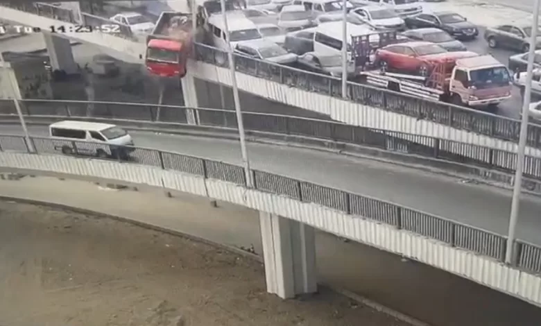 على مدار الساعات القليلة الماضية أثار فيديو متداول على صفحات مواقع التواصل الاجتماعي الرعب، حيث رصد الفيديو خلال 26 ثانية حادثاً مروعا بالطريق الدائري أعلى محور المريوطية أطاحت فيه شاحنة نقل “ تريلا “ بعدد 8 سيارات.