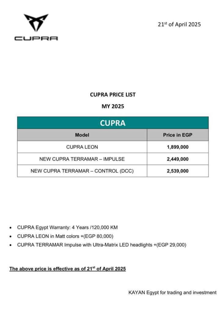 بعد أسبوعين من تقديمها للسوق المحلية؛ طرحت شركة كيان إيجيبت، وكيل العلامة الإسبانية كوبرا في مصر، الفئة الثانية من سيارتها الـSUV المدمجة كوبرا تيرامار. حيث أعلنت عن قائمة سعرية جديدة لطرازات العلامة الإسبانية تضمنت فئتين للسيارة.