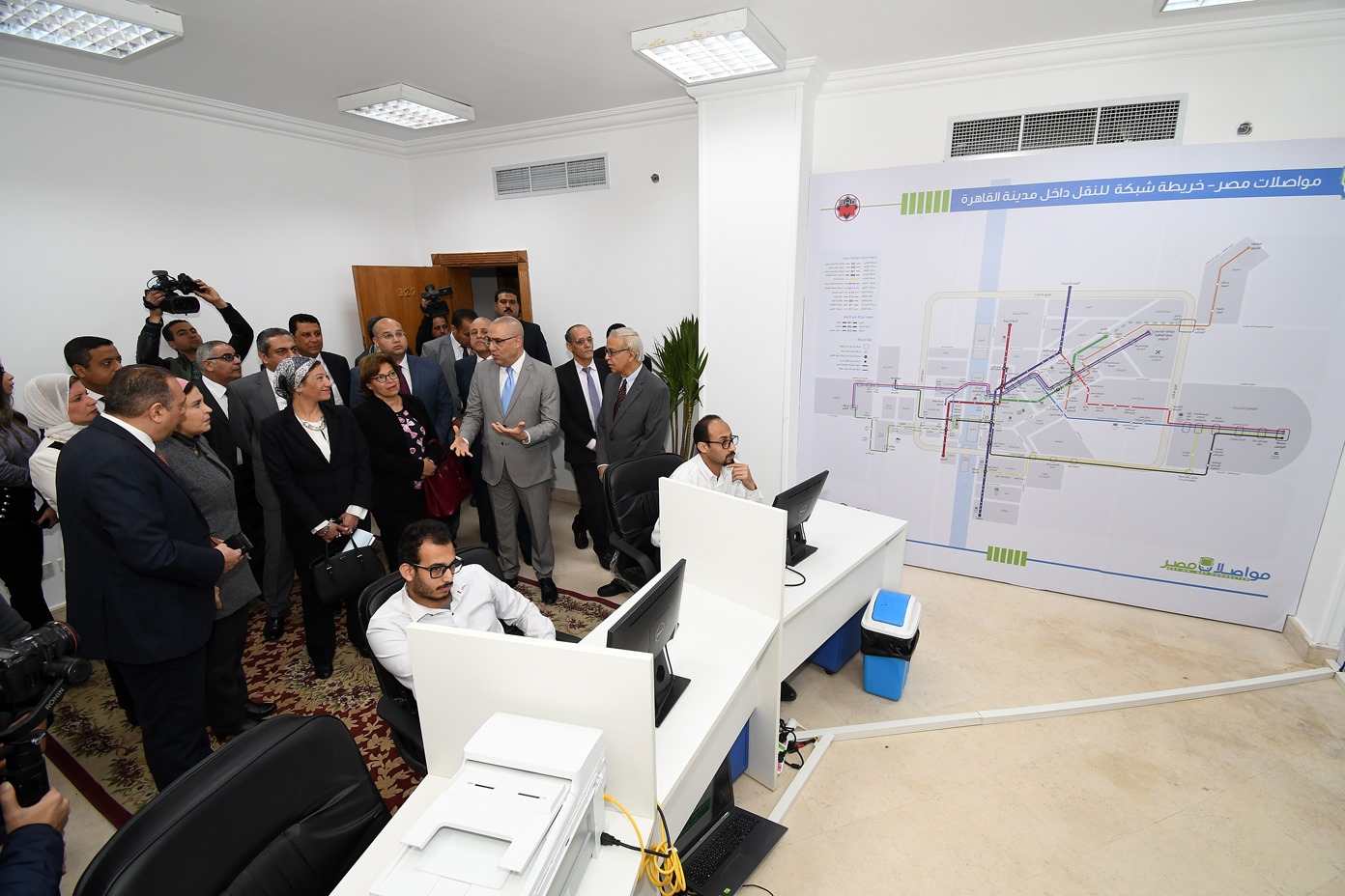 كما تفقد وزيرا الإسكان والبيئة، ومرافقوهم، وحدة التحكم فى وسائل النقل بهيئة المجتمعات العمرانية الجديدة، واستمعوا إلى شرح مفصل عن آلية المتابعة والتحكم فى منظومة النقل الداخلى والخارجى بالمدن الجديدة، والذي يقوم بتشغيلها فريق على أعلى مستوى، ووفقا لأحدث الأساليب لإدارة منظومة النقل الجماعي.