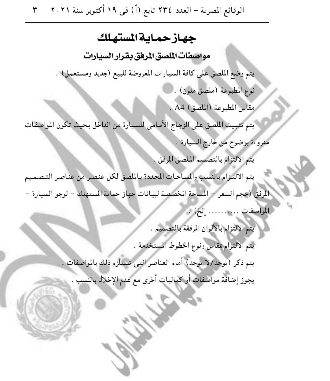 – كما أن يتضمن الإعلان “سعر السيارة شاملاً للضريبة” مواصفاتها موضحا به الآتي ( النوع – الطراز – بلد المنشأ- الفئة – الكماليات ) علي أن يكون الإعلان مُثبتاً بالزجاج الأمامي للسيارة وفقا للمواصفات المُلحقة بالقرار ، وأن يكون السعر المُثبت بالفاتورة الصادرة للمستهلك هو ذات السعر المُعلن عنه .