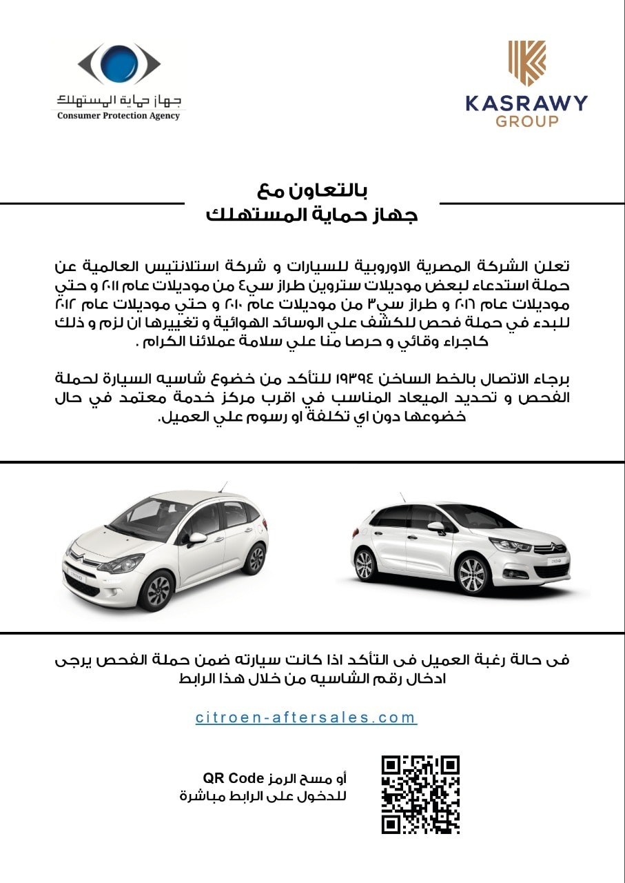 أعلن جهاز حماية المستهلك بالتعاون مع شركة المصرية الأوروبية للسيارات وستلانتيس العالمية عن حملة استدعاء لبعض موديلات ستروين داخل السوق المصرية.