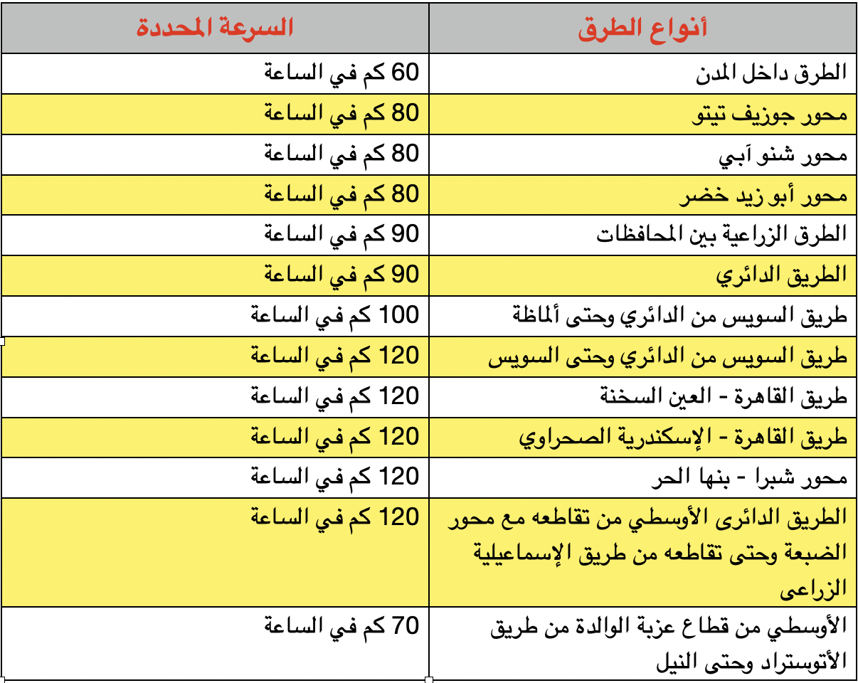 وفي التقرير التالي نستعرض السرعة المقررة لسيارات الملاكي على أهم الطرق الرئيسية والسريعة في مصر، وفقاً لما حددته الإدارة العامة للمرور بوزارة الداخلية، في إطار الخدمات المستمرة التي يقدمها “ إيجيبت أوتوموتيف “ لقرائه ..