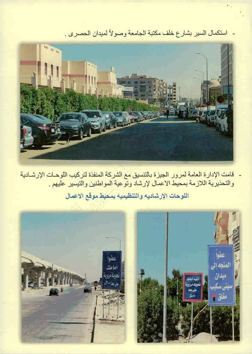 في الوقت نفسه قامت الإدارة العامة لمرور الجيزة بالتنسيق مع الشركة المنفذة بوضع اللوحات الإرشادية والتحذيرية والكشافات والطواحين الضوئية، وتعيين الخدمات المرورية اللازمة بمحيط الأعمال بالكامل، لضمان أمن وسلامة المواطنين وتيسير الحركة المرورية بمحيط الأعمال.