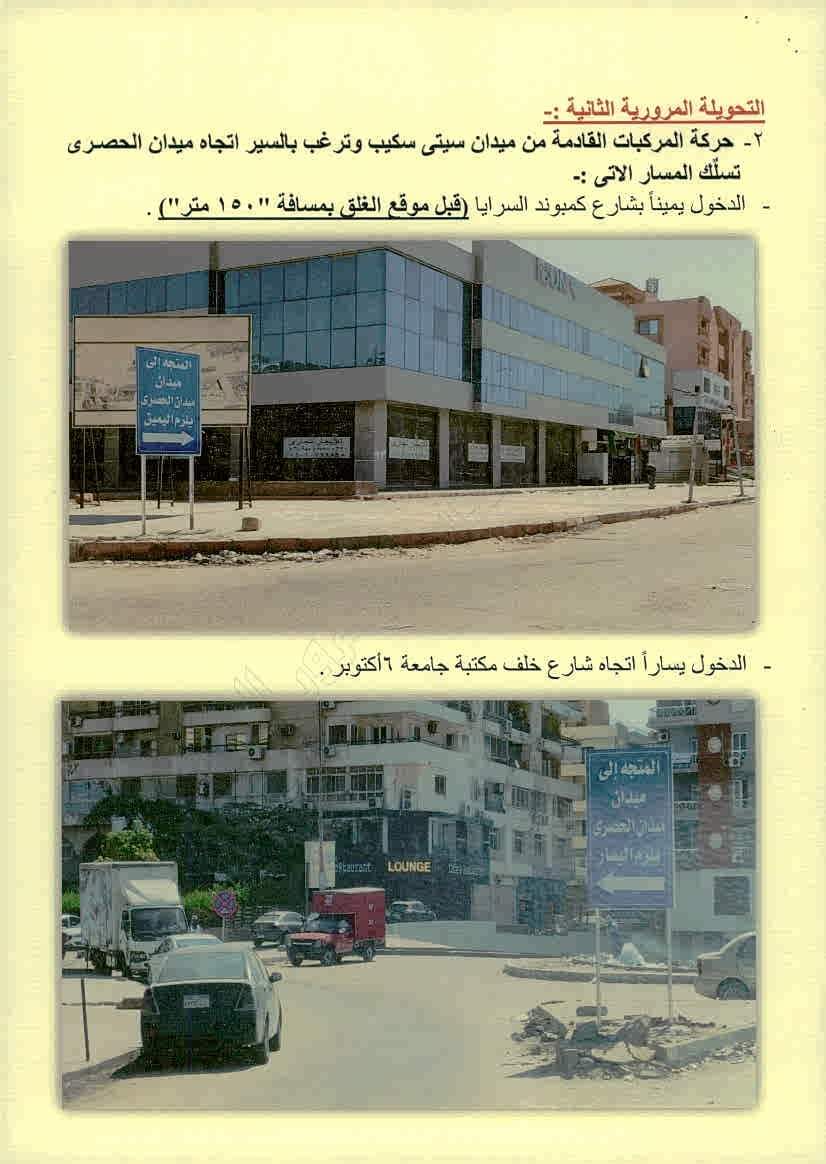 لذا قامت الادارة العامة لمرور الجيزة بالتنسيق مع جهاز مدينة ٦ أكتوبر والشركة المنفذة للتحويلات المرورية كالتالي:
