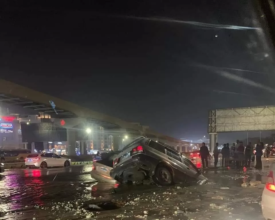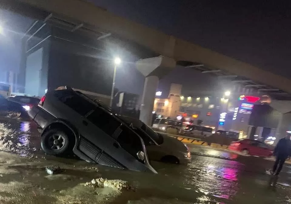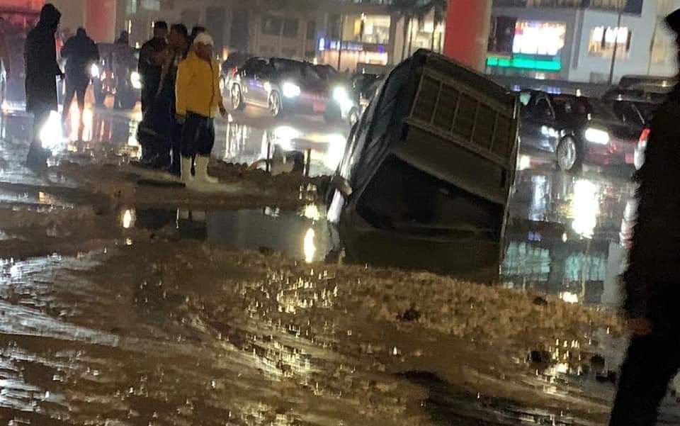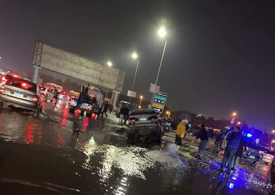 بسبب هبوط أرضي وتراكم مياه الأمطار تصدر شارع التسعين الجنوبي الزحام على مدار اليوم، وتداول رواد السوشيال ميديا والمواقع سقوط بعض السيارات، وذكر شهود عيان أن قوات الحماية المدنية انتقلت إلى المنطقة لشفط المياه وتسير حركة المرور أمام السيارات.