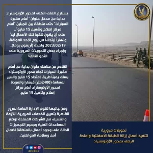 يكون تنفيذ تلك الأعمال ليلاً ونهاراً إبتداءاً من يوم الأحد الموافق 2023/02/19 ولمدة 40 يوما