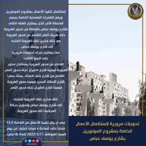 وأرجعت الوزارة أن غلق شارع يوسف عباس يأتي لاستكمال تنفيذ الأعمال بمشروع المونوريل ورفع الكمرات المعدنية الخاصة بجسم المحطة.