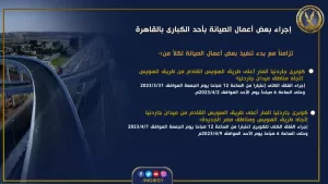 2- كوبري جاردينيا المار أعلى طريق السويس القادم من ميدان جاردينيا جاردينيا اتجاه طريق السويس ومناطق مصر الجديدة، إجراء إعتباراً من الساعة 12 صباحاً يوم الجمعة الموافق 4 أبريل المقبل وحتى الساعة 6 صباحاً يوم الأحد الموافق 9 أبريل 2023.