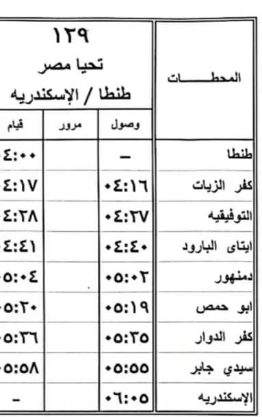 واعتباراً من يوم الأحد الموافق 21 مايو يتم تشغيل قطار ( 129) إكسبريس (طنطا / الإسكندرية) خدمة جديدة بتركيب (10) عربات تحيا مصر علي أن يقوم من محطة طنطا الساعة 04:00 ويصل إلى محطة الساعة 06:05 طبقا للجدول المرفق.