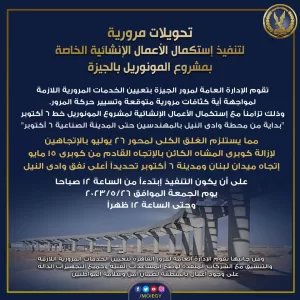 ومن جانبها تقوم الإدارة العامة لمرور الجيزة بتعيين الخدمات المرورية اللازمة،لمواجهة أية كثافات مرورية متوقعة وتسيير حركة المرور، والتنسيق مع الشركات المنفذة لوضع المساعدات الفنية وجميع التجهيزات الدالة على وجود أعمال بالمنطقة لضمان أمن وسلامة المواطنين.