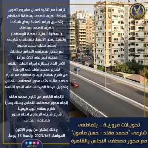 ويستلزم تنفيذ الأعمال إجراء الغلق الكلي لشارع محمد مقلد في الوصلة من شارع هشام لبيب وتقاطعه مع شارع محمد مقلد حتى محور مصطفى النحاس، على أن يتم الغلق اعتباراً من يوم الإثنين الموافق 5 يونيو 2023 ولمدة 13 يوماً، وهو ما يستوجب إجراء تحويلات مرورية للمركبات على النحو التالى: