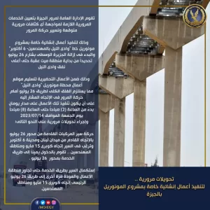 وتقوم الإدارة العامة لمرور الجيزة بتعيين الخدمات المرورية اللازمة لمواجهة أى كثافات مرورية متوقعة وتسيير حركة المرور، وكذلك تعيين الخدمات المرورية اللازمة والتنسيق مع الشركات المنفذة لوضع المساعدات الفنية وجميع التجهيزات الدالة على وجود أعمال بالمنطقة لضمان أمن وسلامة المواطنين.
