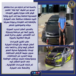 وكانت وزارة الداخلية كشفت عن ضبط ملابسات ما تم تداوله على موقع التواصل الاجتماعي «فيسبوك» متضمناً قيام قائد سيارة بإزالة اللوحات الخلفية للسيارة، وبالفحص أمكن ضبط السيارة المشار إليها مملوكة لأحد الأشخاص المقيم بمحافظة الجيزة، حال تواجده بدائرة قسم شرطة مدينة نصر ثالث بالقاهرة وتبين عدم وجود لوحة خلفيه للسيارة بالمخالفة للقانون.