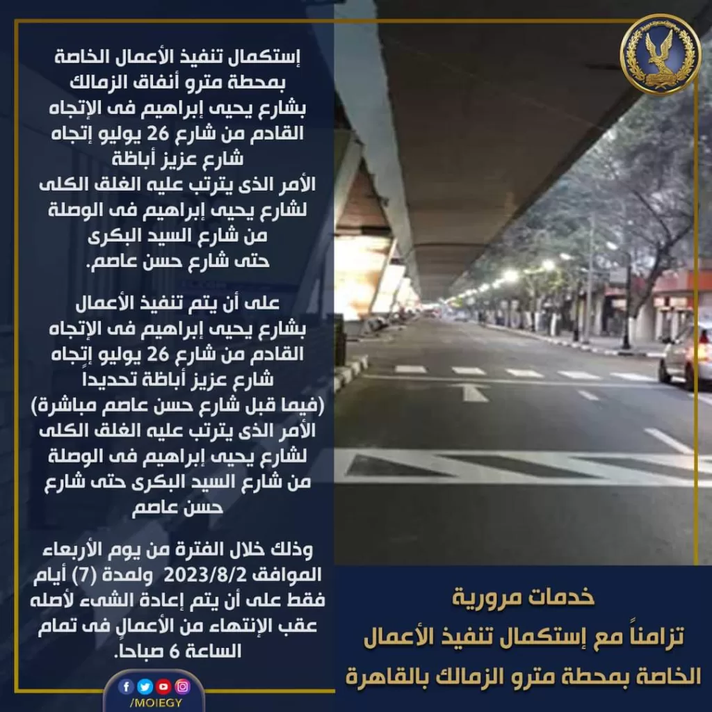 بالتزامن مع تنفيذ أعمال مشروعات النقل وتنفيذ أعمال محطات مترو الأنفاق الخط الثالث، أعلنت وزارة الداخلية عبر صفحتها الرسمية على موقع التواصل الاجتماعي «فيسبوك» غلق شارع يحيى إبراهيم بحي الزمالك غرب القاهرة، وذلك بشكل كلي، اعتبارا من اليوم الأربعاء الموافق 2 أغسطس 2023 ولمدة 7 أيام.