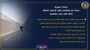 على أن يستمر غلق نفق باقي زكي حتى الساعة السادسة صباح اليوم الأربعاء الموافق 16 أغسطس 2023.