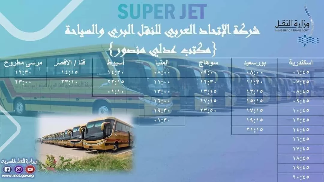 وقالت الوزارة في منشورها أن شركة الاتحاد العربي للنقل البري والسياحة «سوبر چيت» تواصل الإعلان عن مواعيد قيام الأوتوبيسات من محطة عدلي منصور المركزية التبادلية العملاقة إلى المحافظات المختلفة حيث لتقديم أعلى مستويات الخدمة للركاب.