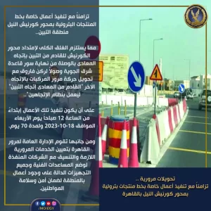 وأوضحت «الداخلية» أن غلق امتداد محور الكورنيش بشكل كلي للقادم من التبين بإتجاه المعادى بالوصلة من نهاية سور قاعدة شرق الجوية وصولاً لركن فاروق مع تحويل حركة مرور المركبات بالاتجاه الأخر “القادم من المعادى إتجاه التبين” ليعمل بنظام الإتجاهين”.