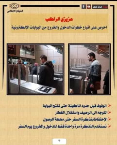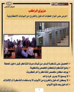 يأتي ذلك فى ضوء ما تقوم به وزارة النقل والهيئة القومية لسكك حديد مصر من عمليات تطوير وتحديث بكافة قطاعات السكة الحديد والتى من ضمنها تركيب بوابات الكترونية وتعيين كمسارية أبواب وأفراد أمن ادارى لمتابعة عملية الدخول والخروج من المحطات وطبقا للتعليمات المنظمة لذلك، والتى تتضمن منع دخول أو خروج أى راكب إلا بعد الحصول على تذكرة السفر .