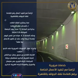 ووفقاً للبيان؛ يبدء تنفيذ غلق مدخل نفق الجولف من الساعة 12 صباح يوم الجمعة الموافق 5 يناير وحتى الساعة الـ 6 صباحا من نفس اليوم، ويستمر الأمر لمدة أربعة ليال، على أن تكون الأعمال ليلاً فقط”.