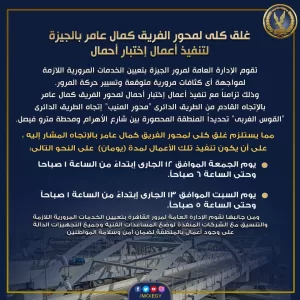 وأوضحت الداخلية في بيانها أن غلق محور الفريق كمال عامر بالاتجاه القادم من الطريق الدائرى «محور المنيب» اتجاه الطريق الدائرى «القوس الغربي».