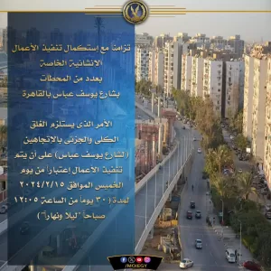 يتم تنفيذ غلق شارع بوسف عباس بشكل كلي وجزئي بالاتجاهين اعتباراً من يوم الخميس الموافق 15 فبراير 2024، لمدة 30 يوماً من الساعة 12:05 صباحاً، على أن يتم تنفيذ الأعمال ليلاً ونهاراً.