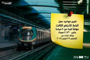 بداية من يوم الخميس الموافق 29 فبراير 2024 سيتم بدء العمل بمحطات الخط الأخضر الثالث في تمام الساعة السادسة صباحاً حتى الساعة الحادية عشر والنصف مساءً وذلك لفترة مؤقتة.