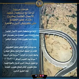 وأوضحت الوزارة في منشورها أن تنفيذ غلق محور كورنيش النيل يأتي بالتزامن مع استكمال تنفيد الأعمال الخاصة بمشروع امتداد محور الحضارة حتى كورنيش النيل ومنها تنفيذ كوبرى مشاة «إبراهيم الرفاعى».