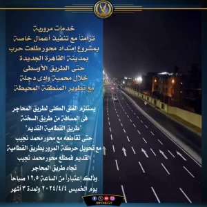 وذكرت «الداخلية» في منشورها أن تنفيذ غلق طريق المحاجر يأتي بالتزامن مع استكمال تنفيد الأعمال الخاصة بمشروع امتداد محور طلعت حرب بمدينة القاهرة الجديدة حتى الطريق الأوسطي خلال محمية وادى دجلة مع تطوير المنطقة المحيطة.