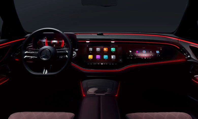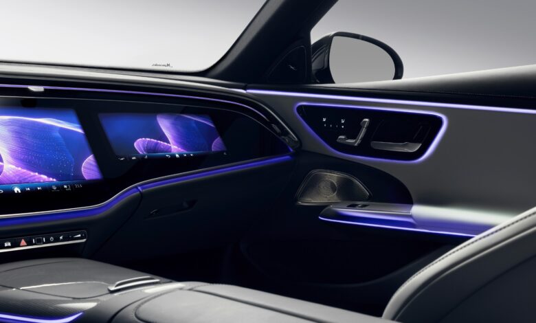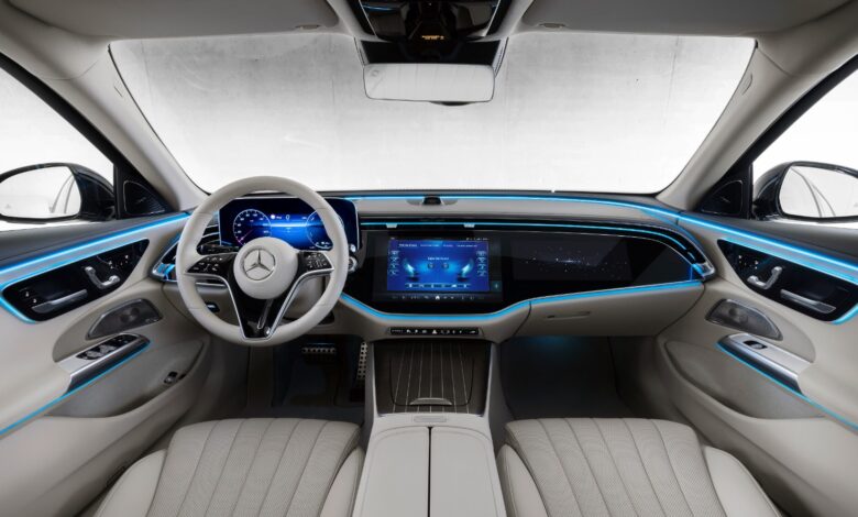 وقدمت الشركة سيارتها عبر فئتين E300 Sport وE300 Exclusive؛ تم تجهيزهما بإضاءة امامية رقمية متطورة، ومقاعد مكيفة مريحة وقابلة للتعديل، ونظام MBUX Superscreen تتضمن شاشة عرض لقائد السيارة قياس 12.3 بوصة، وشاشة مركزية قياس 14.4 بوصة، وشاشة للراكب الأمامي قياس 12.3 بوصة، بالإضافة لنظامBurmester® 4D الصوتي المحيطي بتكنولوجيا Dolby Atmos، وسقف بانورامي متحرك، وعرض البيانات على الزجاج الأمامي، وإضاءة محيطية مع عرض مرئي للصوت، وكاميرا سيلفي/فيديو.