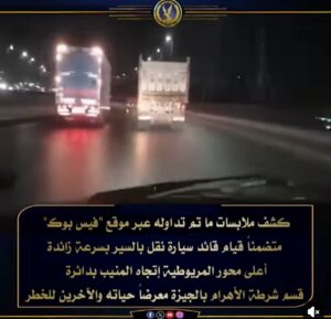 أعلنت وزارة الداخلية كشف ملابسات ما تم تداوله عبر موقع التواصل الاجتماعى “فيس بوك” متضمناً قيام قائد سيارة نقل بالسير بسرعة زائدة أعلى محور المريوطية اتجاه المنيب بدائرة قسم شرطة الأهرام بالجيزة معرضاً حياته والآخرين للخطر.
