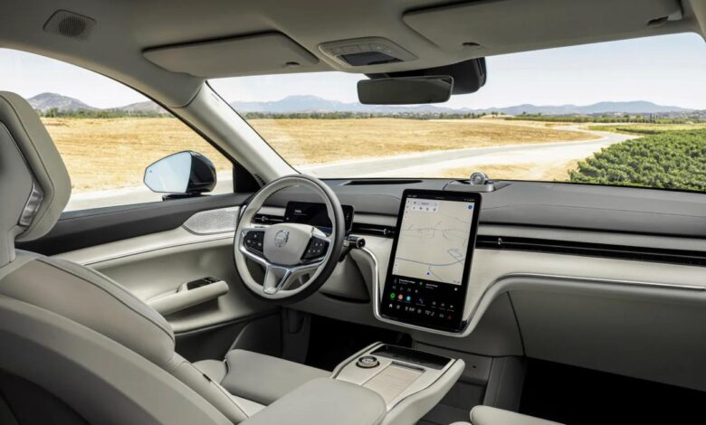 بينما زودت المقصورة الداخلية للسيارة فولفو EX90 بخصائص وصفات عملية. فتبدو لوحة القيادة بشكل أنيق. كما أنها تشتمل على شاشة لمسية لفتح صندوق التابلوه أو لضبط المرآة.