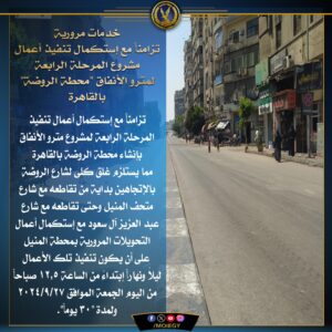 وأوضحت الوزارة في منشورها أن غلق شارع الروضة يتم في الاتجاهين بداية من تقاطعه مع شارع متحف المنيل وحتى تقاطعه مع شارع عبد العزيز آل سعود مع إستكمال أعمال التحويلات المرورية بمحطة المنيل.