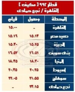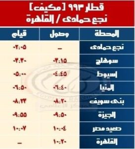 واعتباراً من يوم الاثنين الموافق 25 نوفمبر تشغيل قطار 993 سوهاج/القاهرة، على أن يقوم من محطة نجع حمادي الساعة 02:05 ويصل محطة القاهرة الساعة 10:20 بنفس التركيب الوارد به قطار 992 لمحطة نجع حمادي.