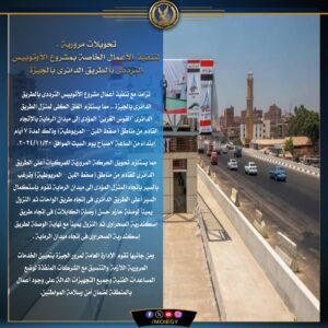 ومن جانبها تقوم الإدارة العامة لمرور الجيزة بتعيين الخدمات المرورية اللازمة لمواجهة أية كثافات مرورية متوقعة وتسيير حركة المرور، وكذلك التنسيق مع الشركات المنفذة لوضع المساعدات الفنية وجميع التجهيزات الدالة على وجود أعمال بالمنطقة لضمان أمن وسلامة المواطنين.