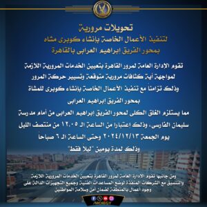 تحويلات مرورية مع غلق محور الفريق إبراهيم العرابي