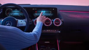 وتعتمد السيارة مرسيدس EQA المحسنة ترقيات في عجلة قيادة جديدة ثلاثية الأضلاع مع أزرار تحكم باللمس، وقطع محدثة على لوحة القيادة والأبواب تتضمن شعارات مرسيدس المضيئة، وشاشة أكبر للمعلومات والترفيه. ويتميز الطراز الأخير بشاشتين مقاس 10.0 بوصات، ومدعومين بأحدث جيل من نظام MBUX.