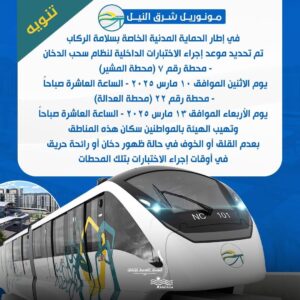 أعلنت الهيئة القومية للأنفاق موعد إجراء الاختبارات الداخلية لنظام سحب الدخان لبعض محطات مونوريل شرق النيل تمهيداً للاختبارات النهائية، وذلك يومي الاثنين الموافق 10 مارس والأربعاء 12 مارس الجاري.