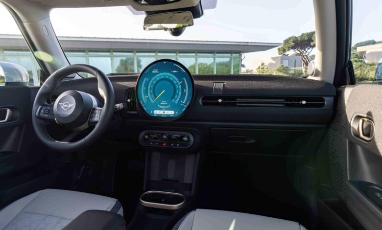 وبالانتقال إلى المقصورة الداخلية التي توفّر مقاعد لخمسة ركّاب؛ فلازال يَغلُب عليها طابع البساطة للنسخة ثلاثية الأبواب، وهي المقصورة المستوحاة مِن سيارة MINI Cooper الكلاسيكية الأصلية في خمسينيات القرن الماضي. إذ يلفت الانتباه للوهلة الأولى الشاشة المستديرة الجديدة فئة OLED قياس 9,4 بوصات التي تتوسّط لوحة القيادة، وهي تعمل عمل شاشة النظام المعلوماتي الترفيهي ولوحة العدادات الرقمية معاً. حيث تعمل بأحدث أنظمة التشغيل العائدة للعلامة البريطانية MINI Operating System 9. كما توفر سبعة أوضاع مختلفة MINI Experience Modes، وهم: Core، وGreen، وGo-Kart، وTimeless، وVivid، وBalance، وTrai.