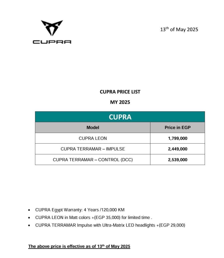 فوفقاً للقائمة السعرية المعلنة من شركة كيان إيجيبت، وكيل العلامة الأسبانية في مصر، تراجع سعر السيارة إلى مليون و 799 ألف جنيه، بالمقارنة بمليون و 899 ألف جنيه وفق آخر تسعير رسمي في شهر أبريل الماضي.