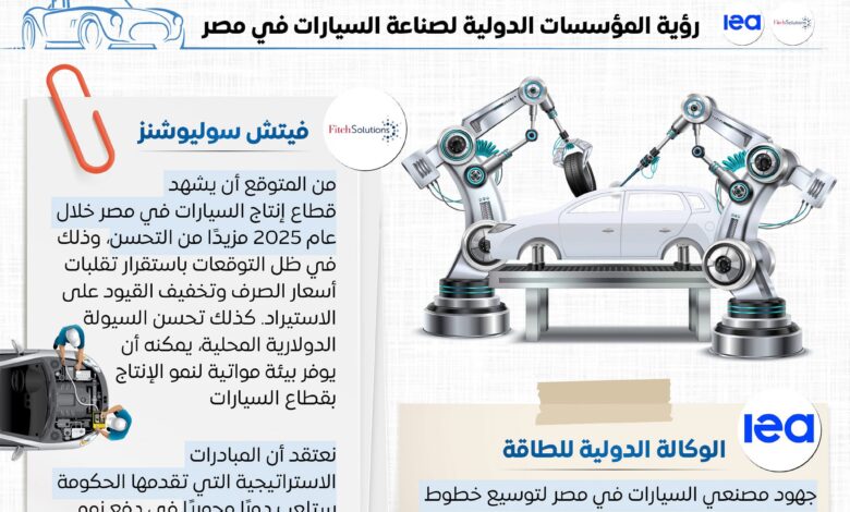 حيث استعرضت الإنفوجرافات توقعات مؤسسة “فيتش سوليوشنز”؛ والتي أشارت إلى أن قطاع صناعة السيارات في مصر يشهد مزيدًا من التحسن خلال عام 2025. وذلك في ظل التوقعات باستقرار أسعار الصرف وتخفيف القيود على الاستيراد. وأشارت المؤسسة إلى أن تحسن السيولة الدولارية المحلية، يمكنه أن يوفر بيئة مواتية لنمو الإنتاج بقطاع السيارات.