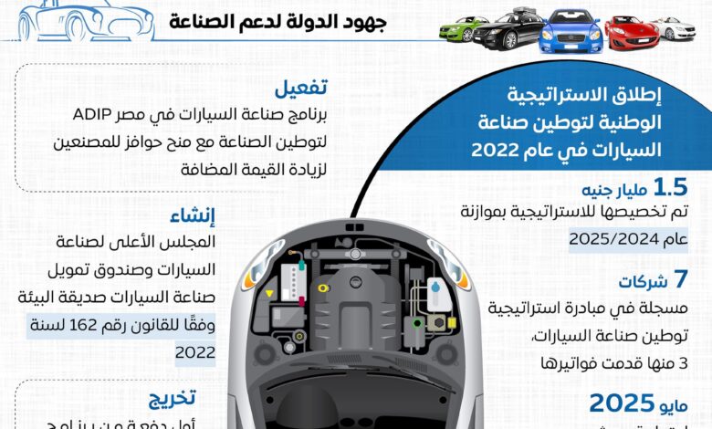 رصد المركز الإعلامي لمجلس الوزراء، عبر عددٍ من الإنفوجرافات على منصاته الرسمية بمواقع التواصل الاجتماعي، تقدم توطين صناعة السيارات في مصر. وذلك في ضوء تقارير المؤسسات الدولية وفقاً للخطوات التي تتخذها الدولة لتوطين وتعزيز صناعة السيارات.