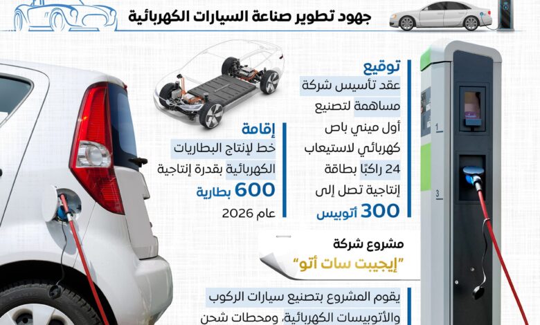 وفيما يتعلق بجهود تطوير صناعة السيارات الكهربائية، تم توقيع عقد تأسيس شركة مساهمة لتصنيع أول ميني باص كهربائي لاستيعاب 24 راكبًا، وبطاقة إنتاجية تصل إلى 300 أتوبيس، إلى جانب إقامة خط لإنتاج البطاريات الكهربائية بقدرة إنتاجية 600 بطارية في 2026.