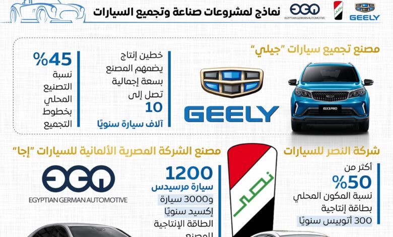 وتضمنت الإنفوجرافات، نماذج لعدد من مشروعات صناعة وتجميع السيارات، منها مصنع تجميع سيارات “جيلي”، الذي يضم خطين إنتاج، بسعة إجمالية تصل إلى 10 آلاف سيارة سنويًا وبنسبة تصنيع محلي تصل إلى 45% بخطوط التجميع.