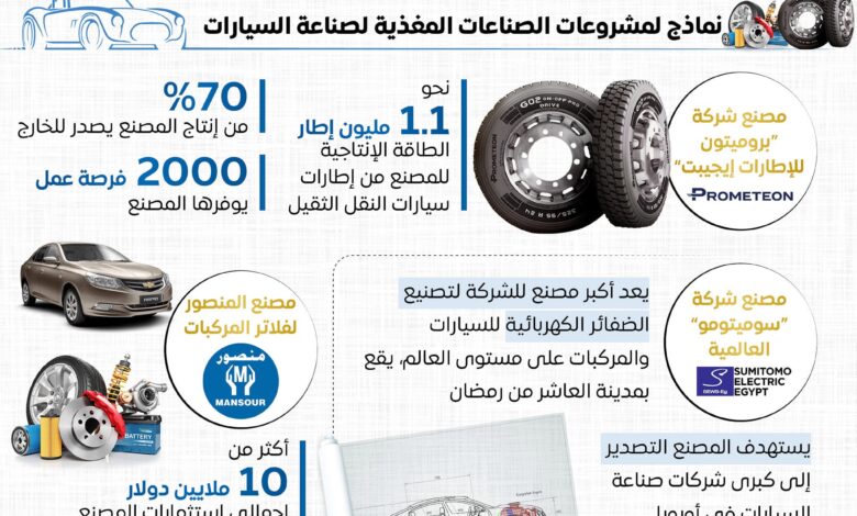 أما مشروعات الصناعات المغذية لصناعة السيارات، فتضمنت مصنع شركة “بروميتون للإطارات إيجيبت”، والذي تصل طاقته الإنتاجية من إطارات سيارات النقل الثقيل إلى نحو 1.1 مليون إطار، يُصدَّر نحو 70% منها للخارج، ويوفر نحو 2000 فرصة عمل، ومصنع شركة “سوميتومو” العالمية بمدينة العاشر من رمضان، الذي يعد الأكبر للشركة عالميًا لتصنيع الضفائر الكهربائية للسيارات والمركبات، ومن المقرر أن يوفر نحو 10 آلاف فرصة عمل، ويستهدف التصدير لكبرى شركات  صناعة السيارات في أوروبا.
