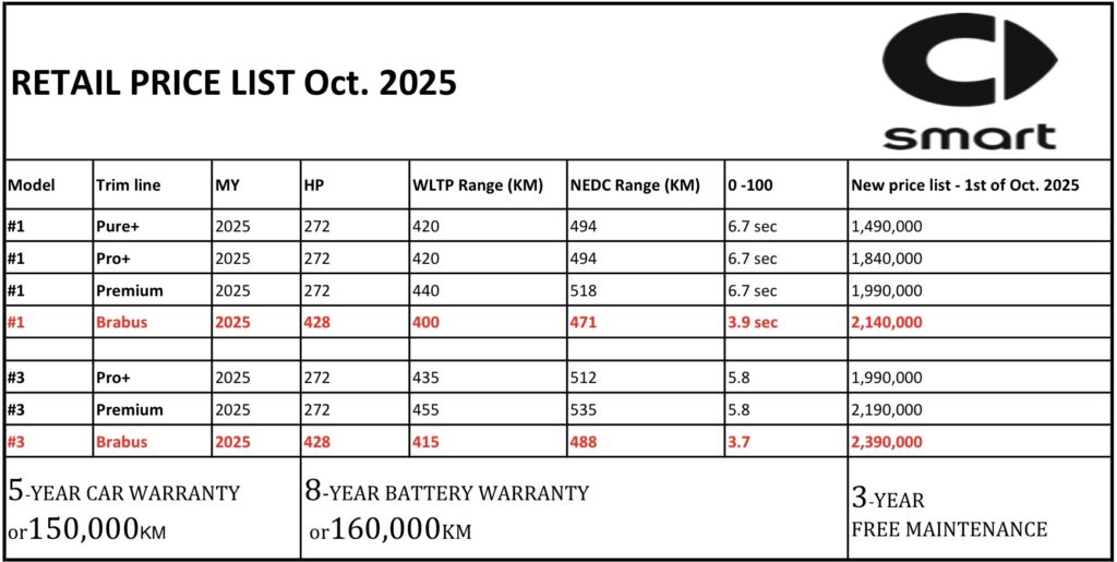فبحسب القائمة الجديدة؛ بدأت أسعار السيارة سمارت #1 من مليون و 490 ألف جنيه. حيث تقدم السيارة عبر أربعة فئات من التجهيزات.