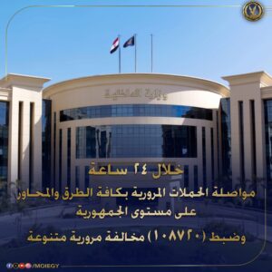واصلت أجهزة وزارة الداخلية حملاتها المرورية المكثفة على مختلف الطرق والمحاور بجميع محافظات الجمهورية، لضبط المخالفات وتحقيق الانضباط المرورى والحفاظ على سلامة المواطنين.