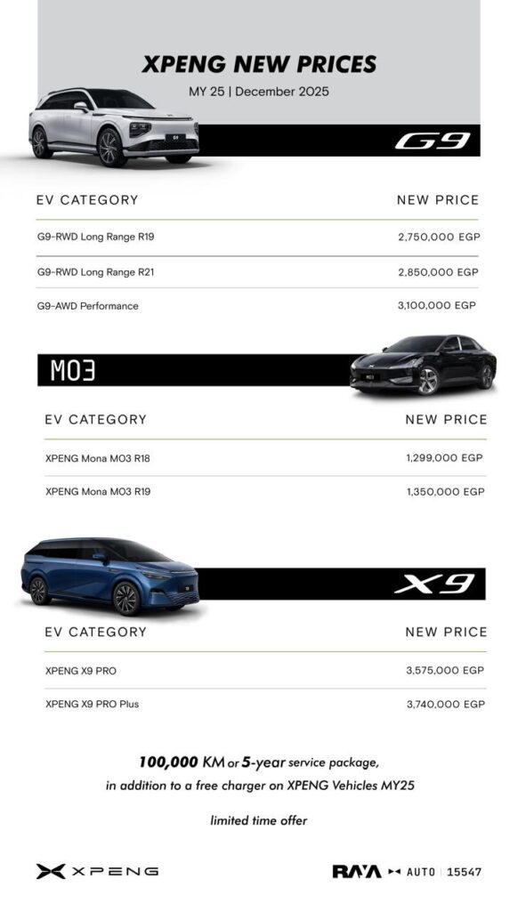 أعلنت شركة راية أوتو، الوكيل الحصري لعلامة XPENG في مصر، عن قائمة جديدة لأسعار سيارات إكسبينج الكهربائية المطروحة في السوق المحلية. طرحت خلالها طرازين جديدين سيدان و MPV. بينما شهدت القائمة تخفيض لطراز G9 وصل إلى 400 ألف جنيه.