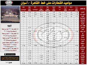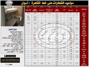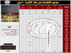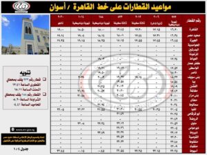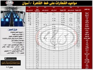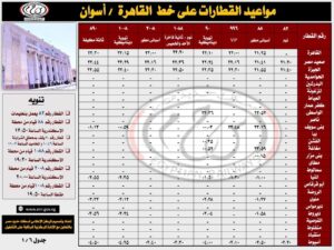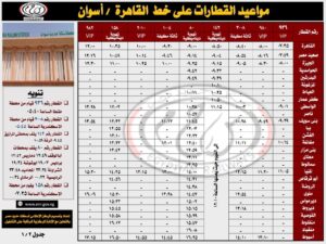 في إطار التيسيرات التي تقدمها الهيئة القومية لسكك حديد مصر، وتيسيرا على المواطنين الراغبين في السفر، أعلنت جداول مواعيد قطارات السفر على خط القاهرة – أسوان، والتي جاءت كما يلي: